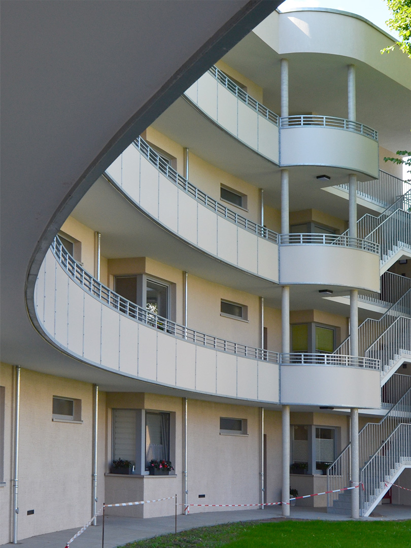 Auf dem rückwärtigen Grundstück entstand der Neubau einer barrierefreien Wohnanlage mit einem Laubengang als Erschließungselement. Die angrenzenden Freianlagen wurden gezielt auf die Bedürfnisse der Bewohner abgestimmt und so gestaltet, dass sie gemeinsame Aktivitäten und Begegnungen ermöglichen.